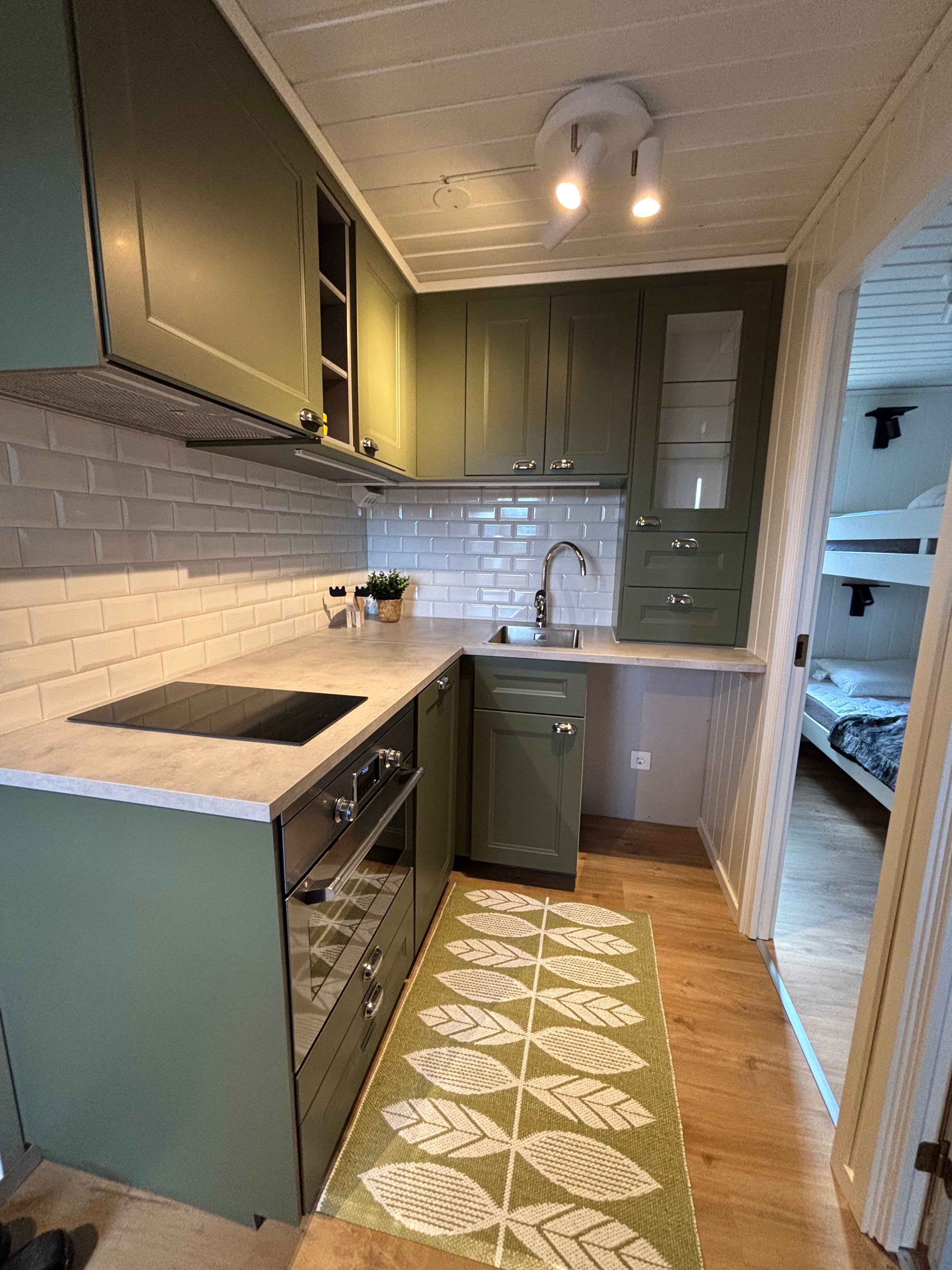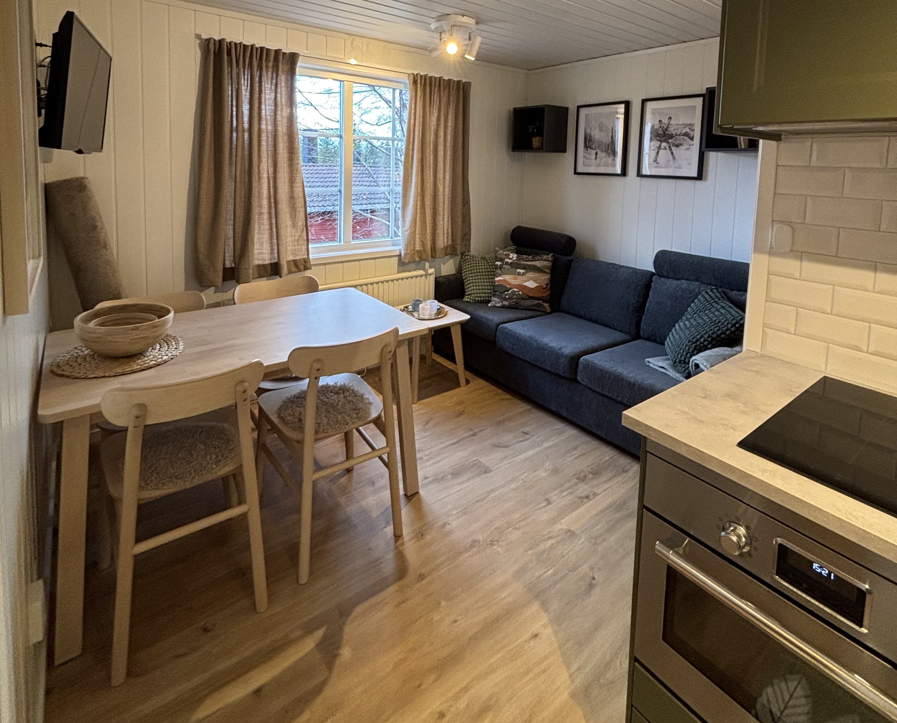 I det ljusa allrummet väntar en bekväm soffa, ett nytt matbord med stolar, samt en väggmonterad TV – perfekt för mysiga kvällar. Köket är helt nytt och fullt utrustat med bra arbetsytor, kombinerad ugn/mikro, diskmaskin och allt du behöver för att laga goda måltider.